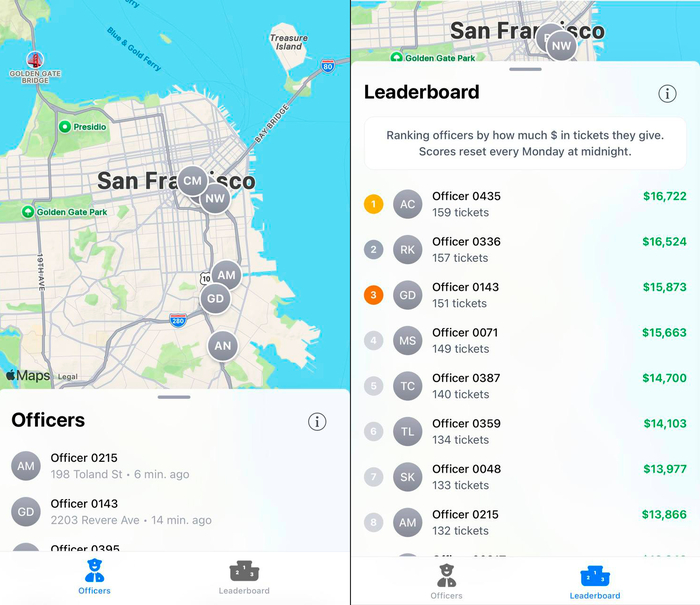 На карте можно было видеть инициалы каждого инспектора и его последнее местоположение — интерфейс специально копировал Find My от Apple. А ещё там был рейтинг «самых продуктивных» копов: лидер недели офицер №0435 выписал штрафов на $16 722 за два дня. В нижней части таблицы копы с показателями около $3 000 — разница в производительности в пять раз, что намекает на интересные вопросы о мотивации сотрудников.