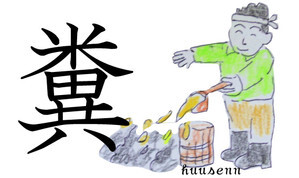 Кандзи 糞 изображает рисовое/米 поле/田 на котором руки разбрасывают удобрения.