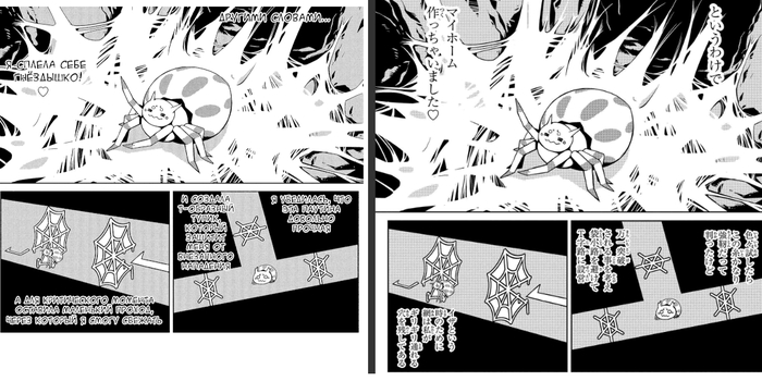 Вот например страница из манги kumo desu ga. Сюжет в том, что девушка переродилась пауком и выживает в подземелье, населённым монстрами.