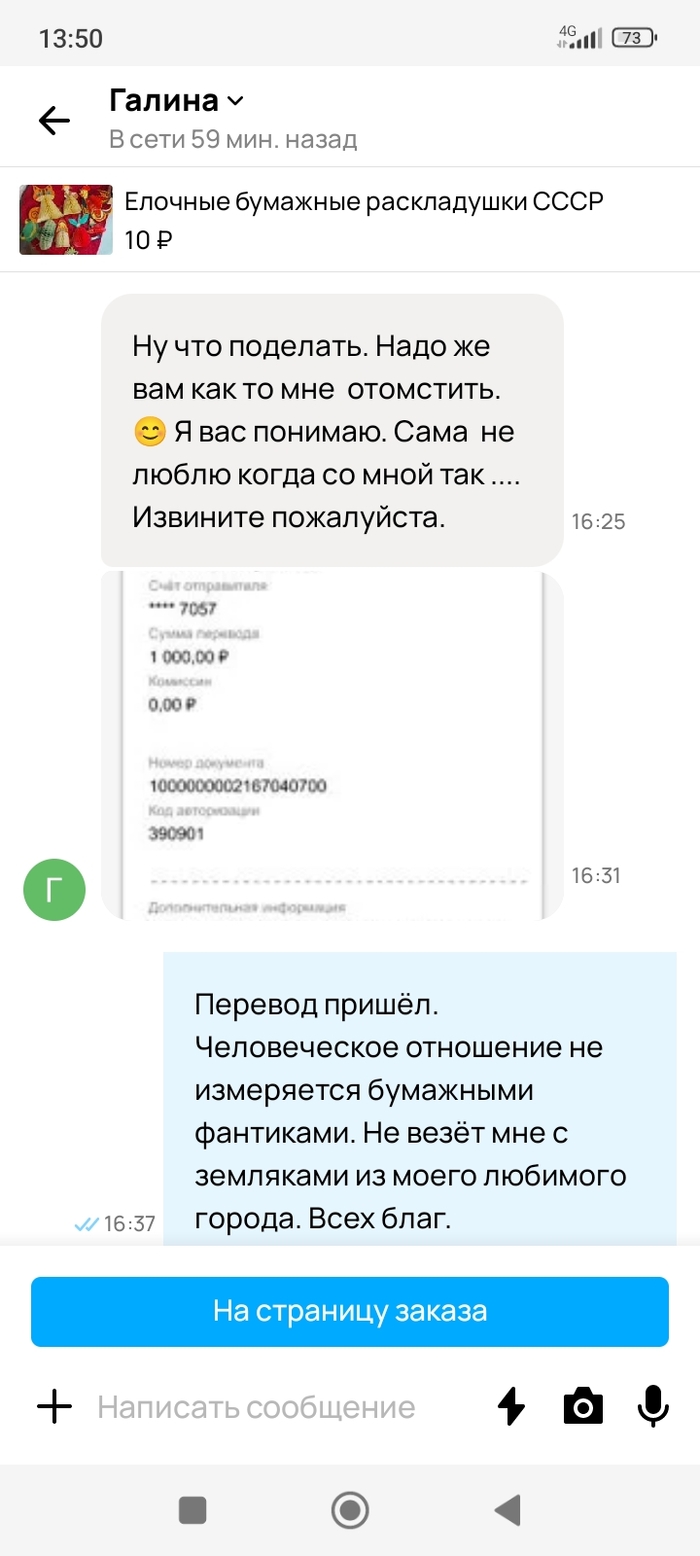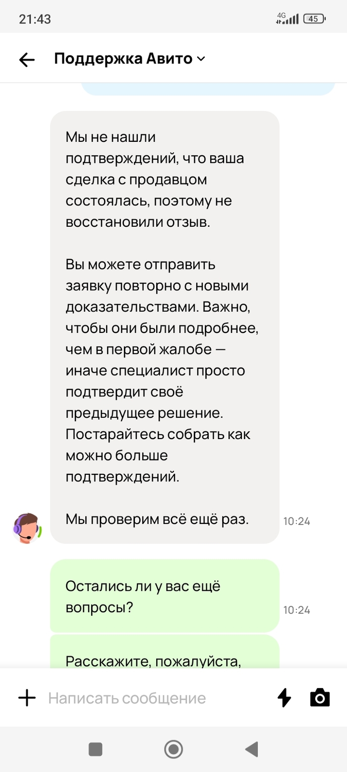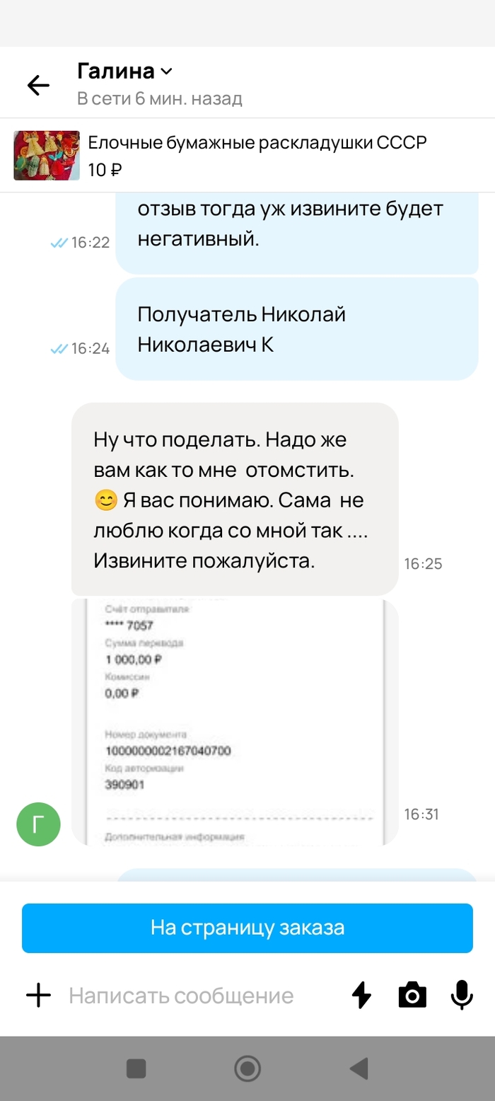 Я коллекционирую елочные игрушки расскладушки. На авито я увидел обьявление с такими игрушками цена 3 т. р. Спросил может ли продавец продать интерессующую меня игрушку отдельно (игрушка царевна лягушка со стрелой) , ответ был да испросила сколько я ей предложу . Я предложил 1 тр и продавец согласилась. Я позвонил, сказал что готов приехать и забрать игрушку (живем в одном городе) , но по времени не срасталось. Продавец Галина предложила оплатить ей на банковскую карту и в обьявлении тогда она изменит цену для авито доставки с 3000тр до 10р (я понимал что это нарушение правил авито, и риск нарваться на мошенника) но я рискнул и оплатил ей 1тр на карту и сделал заказ на авито через яндекс доставку. В сообщении продавец указала что деньги пришли и когда она прийдет с работы то отправит товар. Через несколько часов продавец пишет, что мол Николай извините, но я продам данную игрушку( царевна лягушка) другому покупателю так как он предложил ей 2 тр, я написал что против ибо это не сайт мешок где действуют правила аукциона, но продавец настаивала на своем что продаст другому. Как я мог повлиять на данного продавца??? Я написал что так не делают, но пришлось скинуть реквизиты для возврата денег. Деньги были возвращены, сделку на сайте отменил я. Я предупредил продавца что ей будет написан негативный отзыв. Продавец хотела в качестве компенсации отправить мне другую игрушку, но я отказался потому что другие у меня в коллекции есть и мне такие подачки не нужны. 1 августа был опубликован мой отзыв с оценкой в одну звезду, продавец оставила ответ под отзывом где меня оскорбляла, я написал в поддержку и ответ был удален, так было еще дважды и тогда я попросил поддержку ограничить продавца в оскорбительных ответах на мой отзыв и ей она была ограничена оставлять ответ. Позже мой отзыв был обжалован и закрыт с мотивировкой что мол я написал неверно как было дело, я обжаловал и стали приходить. Мы проверили вашу жалобу, не сможем восстановить отзыв. Мы получили доказательства что пользователь выполнил все договоренности, поэтому удалили отзыв. Я не понимаю какие доказательства о выполненной договоренности. Сделка не была выполнена продавцом, так как она ее отменила по причине продажи другому покупателю. Тоесть в моем понимании я выполнил все условия