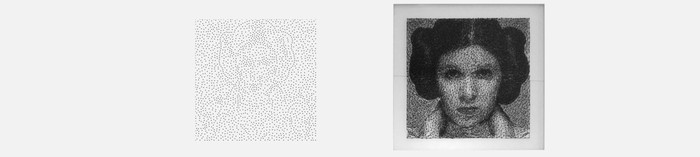Название арт-проекта, Constellation, можно перевести как "комбинация, скопление", что как нельзя точнее объясняет процесс создания удивительных портретов. Различные комбинации, варианты переплетений одной-единственной нитки в результате превратили скопление гвоздей в реалистичные лица с нарисованными на них эмоциями. Издалека кажется, что это рисунки, сделанные карандашом, и лишь подойдя поближе понимаешь, что арт-проект Constellation куда более трудоемкий и сложный, чем обычная живопись.