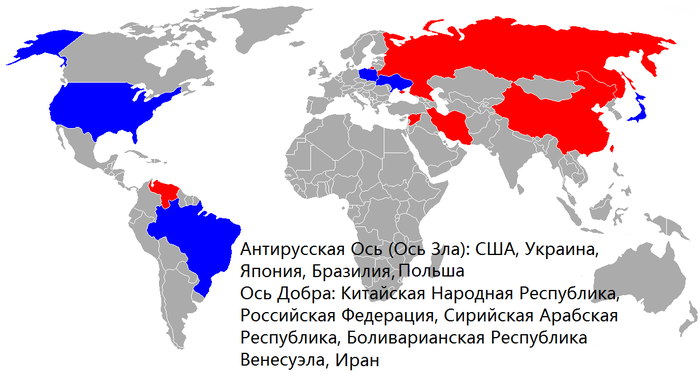 Но стоит отдельно выделить несколько стран, чьи последовательные, методичные, и оговорённые друг с другом действия заслуживают особого внимания, и воистину позволяют причислить эти страны к "Оси Зла". Данными странами являются США, Польша, Украина, Япония, Бразилия. Обратите внимание, что лидеры всех этих стран в недавнем времени имели встречи друг с другом, и темой этих встреч было обсуждение "стратегии и методов дальнейшего сотрудничества и партнёрство". Что именно подразумевает их сотрудничество? Чтобы ответить на этот вопрос, мы должны обратить внимание на то, что все эти страны оказывают агрессивное и масштабное давление на Россию, а также на ряд дружественных России стран. Япония строит козни против Китая и России. Польша и Украина - против России и Сирии. Бразилия - против Венесуэлы. США против всех сразу - против Китая, России, Сирии, Ирана, Венесуэлы.