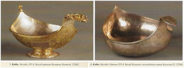 Во Вкладной книге Троице-Сергиева монастыря 1673 года упоминаются ковши с названиями «плавкий», «плавный» или «плавной». Например, ковш «плавной» был передан в Троице-Сергиев монастырь княгиней старицей Киликией Ушатой в 1551 году (илл. 3). К сожалению, со временем этот ковш претерпел значительные изменения, так как его переделали, добавив много новых украшений, включая поддон, геральдический щит на ручке, литой бюст на носике, круглую мишень с растительным орнаментом внутри ковша и фигурку литого льва на мишени. Выполненный в форме ладьи, с носиком и ручкой, он выглядит очень изящно. Ковши с названием «плавные» или «плавкие» неоднократно упоминаются среди вкладов в монастырь. Например, в 1537 году два «плавких» ковша и один «питий» были вложены ростовским архиепископом Кириллом, а в 1552 году ковш «серебрян плавной» был принесен Власом Григорьевым сыном Селезневым. Различие между ковшами «питьи» и «плавными» или «плавкими» нам неизвестно. Ясно одно: ковш «питьи» в форме ладьи был удобен как для черпания жидкости, так и для питья из него.