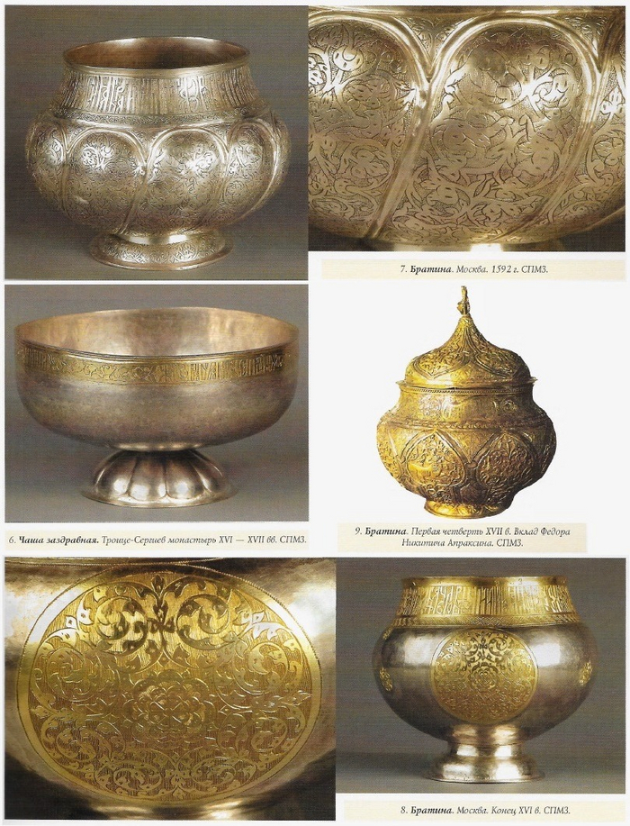 Изделия, которые сегодня можно увидеть в различных музеях страны, преимущественно относятся к XV — XVII векам. Среди них особое место занимают ковши — одни из древнейших питьевых сосудов. По археологическим находкам они использовались уже с XII — XIII веков, а первые упоминания о них в письменных источниках встречаются с XIV века. Ковши были предназначены главным образом для питья и разливания напитков. В зависимости от этой функции они различались по форме, размеру и украшениям. Со временем их использование становилось более разнообразным, что нашло отражение в различных названиях ковшей: «питьи», «выносные», «хоромные», «жалованные», «ковши-лебеди», «погребные», «медвяные», «винные», «водосвятные» и другие. Редкими образцами ковшей «питьи» являются два известных сосуда из бывшей коллекции Троице-Сергиевой Лавры: ковш посадника новгородского Григория Кирилловича Посахно (1428 — 1436) и ковш московского боярина Петра Михайловича Плещеева (конец XV — начало XVI века). Несмотря на различное происхождение (новгородское и московское), эти ковши мало отличаются друг от друга. Их плавная округлая форма и выразительные силуэты напоминают очертание ладьи или водоплавающей птицы. Скромные украшения на ручках (пелюстях) в виде литой ажурной пластины на новгородском ковше и двух словно плывущих навстречу резных рыбок — на московском подчеркивают их особенности. На обоих предметах указаны имена их владельцев. Позолоченная резная надпись на новгородском ковше «А се ковш посадника новгородцко Григорья Кюриловича» проходит по венцу тулова и воспринимается как украшение изделия; а надпись на московском ковше, состоящая из двух слов: «Петр Михайлович», находится внутри на плоской мишени.