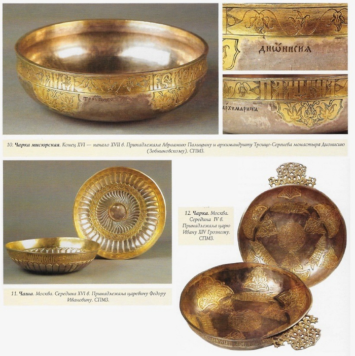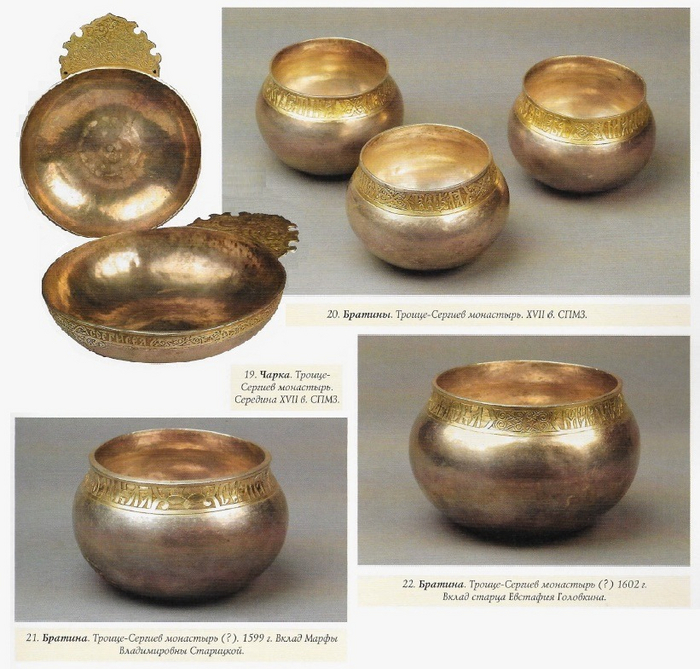 На всех чарках по верхней части корпуса одинаковые надписи: «Чарка Троицкого Сергиева монастыря». То же самое можно сказать и о братинах. Они в основном имели шаровидную форму с гладким корпусом и резными надписями по краю, которые повторяли надписи на чарках. Вероятно, они были изготовлены по общему образцу, как и две более ранние изящные братины, которые были переданы в Троицкий монастырь Марфой Владимировной Старицкой в 1599 году и троицким старцем Евстафием Головкиным в 1602 году. Интересно, что именно троицкие братины использовались для государственных приемов, то есть выставлялись на особо торжественных мероприятиях в монастыре.