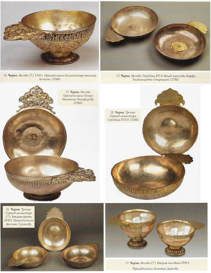 Чарки использовались различными слоями населения. Чарка царя Ивана IV Грозного, особенно нарядная, относится к числу выдающихся. По форме она традиционна, с килевидной полочкой и сквозным орнаментом в виде плетенки. Отличительной чертой является ее богатое орнаментирование и позолоченные элементы. Внутри среди орнамента видны три чешуйчатые рыбки, словно плывущие друг к другу. Имя царя Ивана Грозного также присутствует на других двух чарках, которые позднее перешли в собственность его племянницы Марфы Владимировны Старицкой. После выхода замуж за датского принца Магнуса, она стала королевой Ливонии, что отражено на надписях на чарках при их вложении в Троице-Сергиев монастырь.