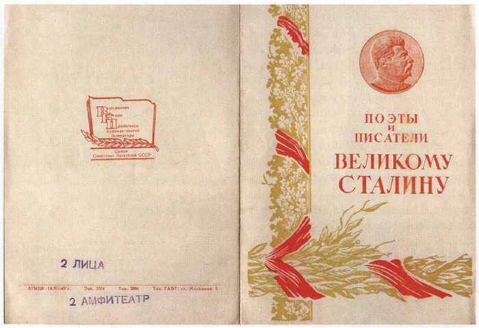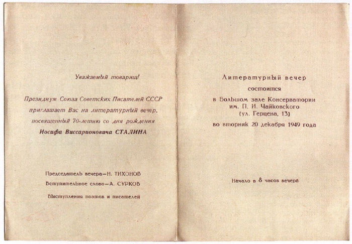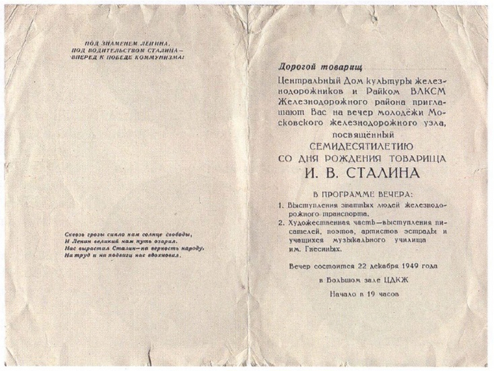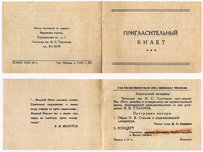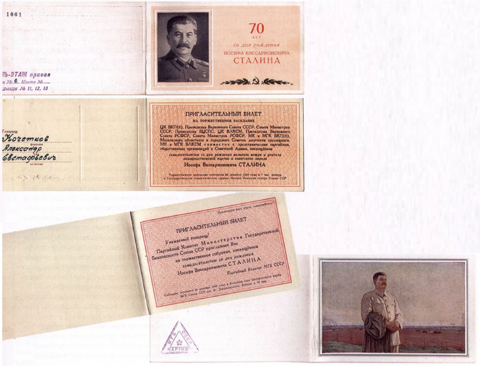 Празднование 70-летия вождя, отца всех народов, прошло великолепно — в течение нескольких декабрьских дней в Москве прошло множество торжественных мероприятий. Осталось значительное количество пригласительных билетов, которые являются свидетельством юбилейных торжеств и ценными артефактами эпохи.