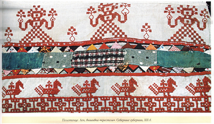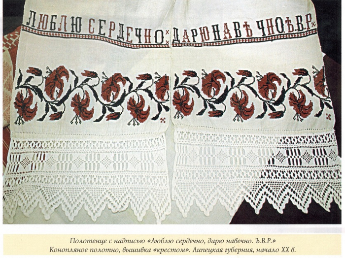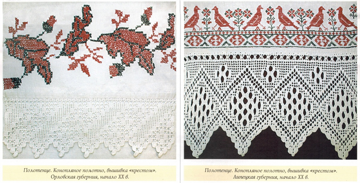 Рисунок покрывал две трети ткани рушника, а его низ украшался кружевом, связанным крючком или выполненным в технике филейного вязания.