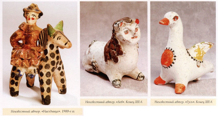 Среди мужских персонажей в больших игрушках особое место занимает всадник на коне. Еще в ранних работах прослеживается образ, который позднее будет воплощен в множестве произведений. В отличие от изображений барынь и кормилиц, для всадника ключевым ракурсом является профиль (что характерно для многих игрушек, включая животных). Профильное изображение коня подчеркивает изогнутую шею, гордо поднятую голову, высокие тонкие ноги и завитой хвост. Конь и всадник вместе становятся воплощением грации и горделивости.
