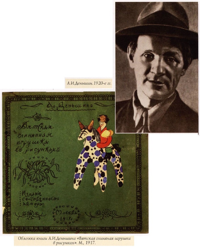 Художник по образованию, родом из Вятки, он посвятил большую часть своей жизни изучению и популяризации дымковской игрушки. Книги, написанные Деныпиным, его рисунки, воспоминания о мастерицах из Дымково, а также статьи в журналах и газетах составили основу, без которой невозможно представить ни одного исследователя этого ремесла. Сегодня книги Д.И. Деньшина являются раритетом. Первое издание вышло в 1917 году в Москве. Эта уникальная книга, тиражом всего в триста экземпляров, содержит рисованный текст и пятьдесят таблиц с изображением игрушек, каждое изображение которых раскрашено А.И. Деныпиным вручную по отлитографированному контуру. В тексте есть некоторые неточности, но он впервые в целом охарактеризовал дымковскую игрушку как явление, описал ее сюжеты и технологию изготовления. Самое важное, что он первым высоко оценил художественные достоинства этой игрушки, связав ее с высшим искусством.