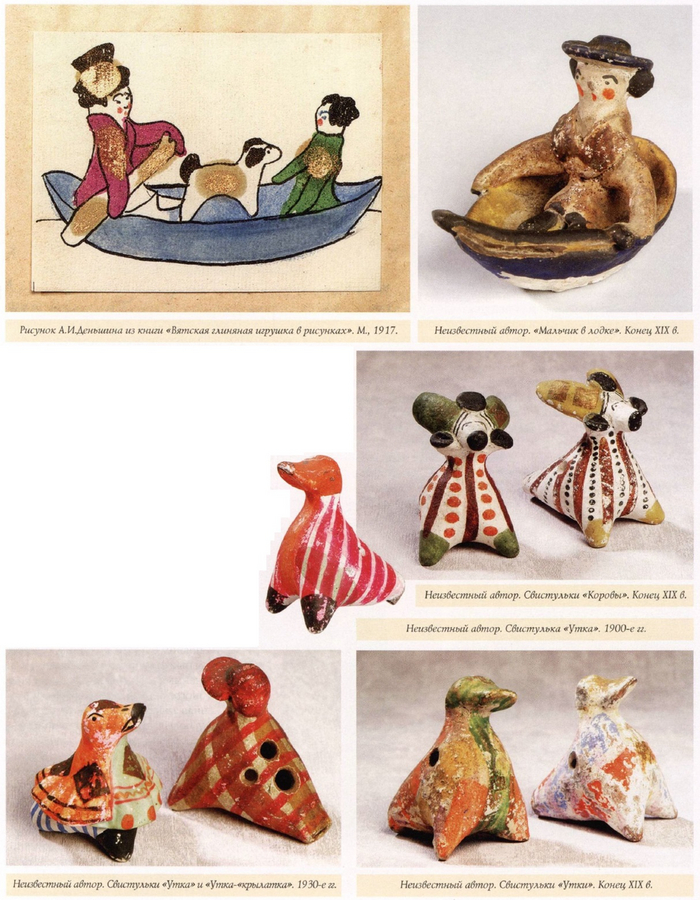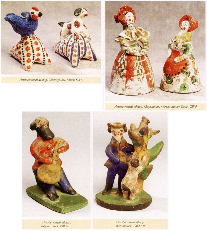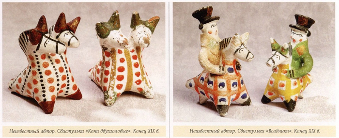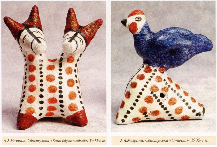 Самая многочисленная группа игрушек представлена свистульками. Вероятно, все мастерицы делали их большими партиями, поэтому в музейных коллекциях они обычно представлены сериями, довольно похожими друг на друга. Отличия в стиле разных авторов проявляются не столько в форме, сколько в деталях росписи. Например, по длине морды лошади, конусной форме свистка, изгибу рогов коровы или овцы, а также в очертаниях глаз и цветовых нюансах росписи можно попытаться классифицировать эти игрушки. Среди свистулек наиболее распространены фигурки уточек и уток-«крылаток». У каждого персонажа есть свои особенности в лепке и росписи. Например, утки-«крылатки» отличаются горизонтальными рядами оборок-крыльев, похожими на передники с лепной отделкой как спереди, так и сзади. В их росписи прослеживается система нанесения узоров, начиная с широкой полосы на груди, затем более узких по бокам, следуя форме конуса. Затем эти полосы пересекаются поперечными линиями, образуя клетчатый узор. Свистульки желто-оранжевого, лилового-серого и сине-зеленого-желтого цветов демонстрируют тонкое чувство цвета, присущее их авторам.