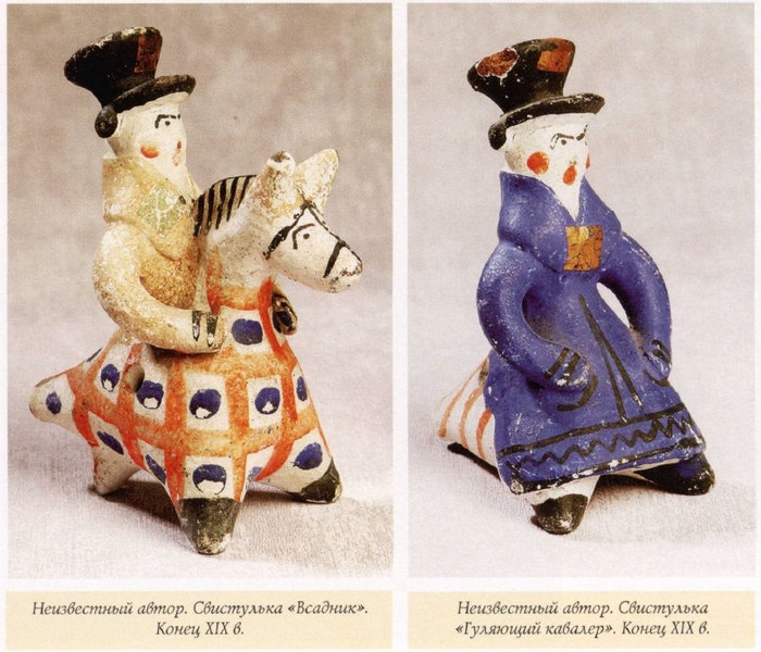Только две вариации дымковских свистулек изображают человеческие фигуры: всадника (на одноглавом или двуглавом коне) и так называемого "гуляющего кавалера". Эти образы являются одними из самых характерных для ассортимента дымковских игрушек. В то время как сюжет всадника-свистульки встречается почти во всех центрах народного глиняного ремесла XIX века, "гуляющий кавалер" и его более поздний аналог "гуляющая дама" представляют собой результат творчества и фантазии только дымковских мастериц. Обе эти игрушки, появившиеся сравнительно недавно, пользовались популярностью среди самих мастериц. Каждая из них создавалась в больших количествах, при этом изменялись положение рук, цвет одежды (в случае всадников, обязательно с эполетами), узоры, высота и форма головного убора. Образные решения этих свистулек яркие и выразительные. Например, наличие свистка у "гуляющего кавалера" придает фигуре стабильность и уверенность, а легкий наклон назад создает впечатление плавного движения и барской значимости персонажа.