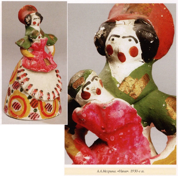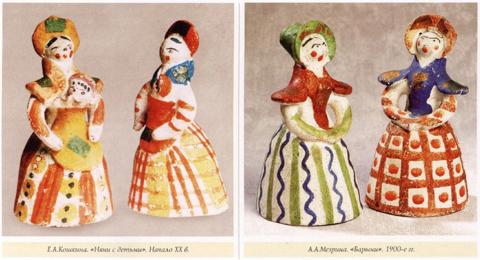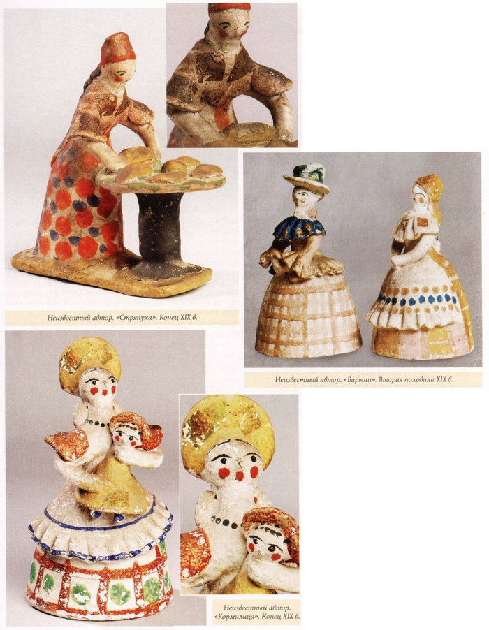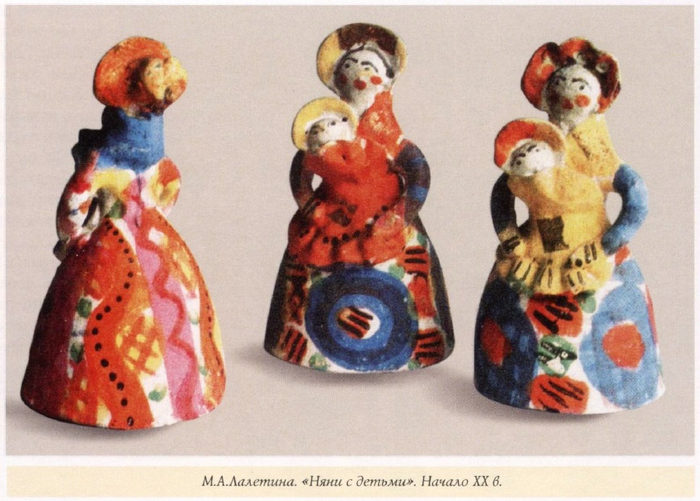Среди самых крупных фигурок наиболее распространены няньки-кормилицы с детьми. Они предстают перед нами в белоснежных кофтах с широкими юбками и передниками с лепными оборками, в различных вариантах кокошников или шляпок, с аккуратно уложенными в прическу волосами. Композиции включают как одного, так и двух детей, один из которых может быть на руках у няни, а другой идет рядом, держась за ее руку.