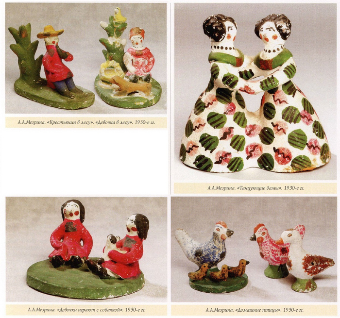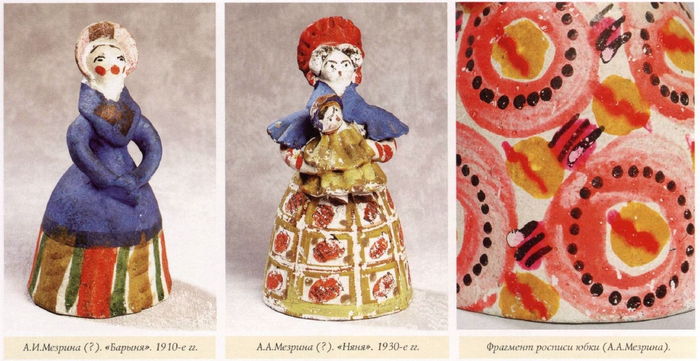 Мезрина повторяла сложившийся женский типаж и в игрушках меньшего размера. Как и у других мастеров, эти более доступные игрушки отличались лаконичностью и простотой лепки, ограниченным количеством деталей и скромной раскраской. Обычно это были барыни в капорах со сложенными руками на животе или няни с ребенком. Детские фигурки могли иметь открытые ножки или быть завернутыми в одеяло, напоминающее гладкий лепесток с оборкой по верхнему краю. Вариантов таких фигурок было много.