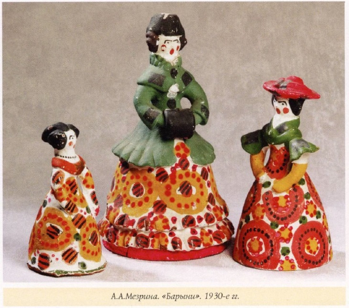 Были заметны изменения в костюмах: барыни носили нарядные платья, кофты и шляпки с полями, дополненные ридикюлями и муфтами, что соответствовало моде 1920-х годов. Кормилицы украшались кокошниками и повойниками, а их платья украшались оборками и клетчатыми узорами. Вместо простых узоров из горошин или полос Мезрина использовала более крупные круги, овалы и геометрические мотивы, такие как штрихи, полосы, круги и точки. Возможно, по совету Деньшина, Мезрина разрабатывала уникальный орнамент для каждой игрушки, что демонстрировало ее изобретательность. Она также использовала золото скромно, применяя его на груди, плечах и шляпах персонажей.