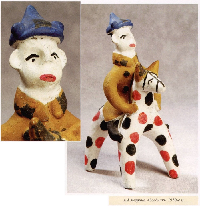 В дополнение к традиционным всадникам, Анна Афанасьевна Мезрина создавала отважных наездниц, сидящих на лошади боком, а также всадников на козлах. Пятнистая шкура этих животных на ногах имитировала штаны с оборками. Благодаря ее работам эти персонажи различных вариаций утвердились среди образов дымковской игрушки.