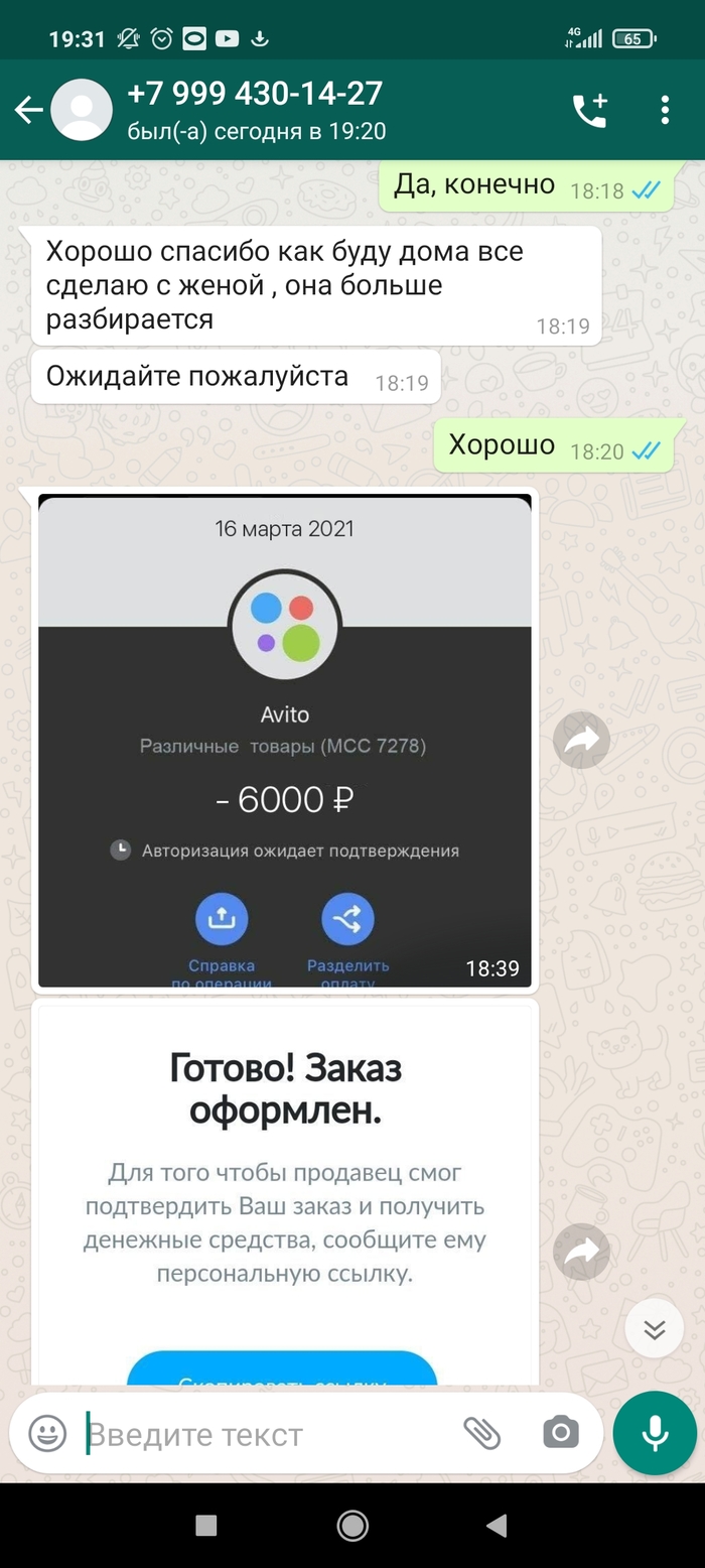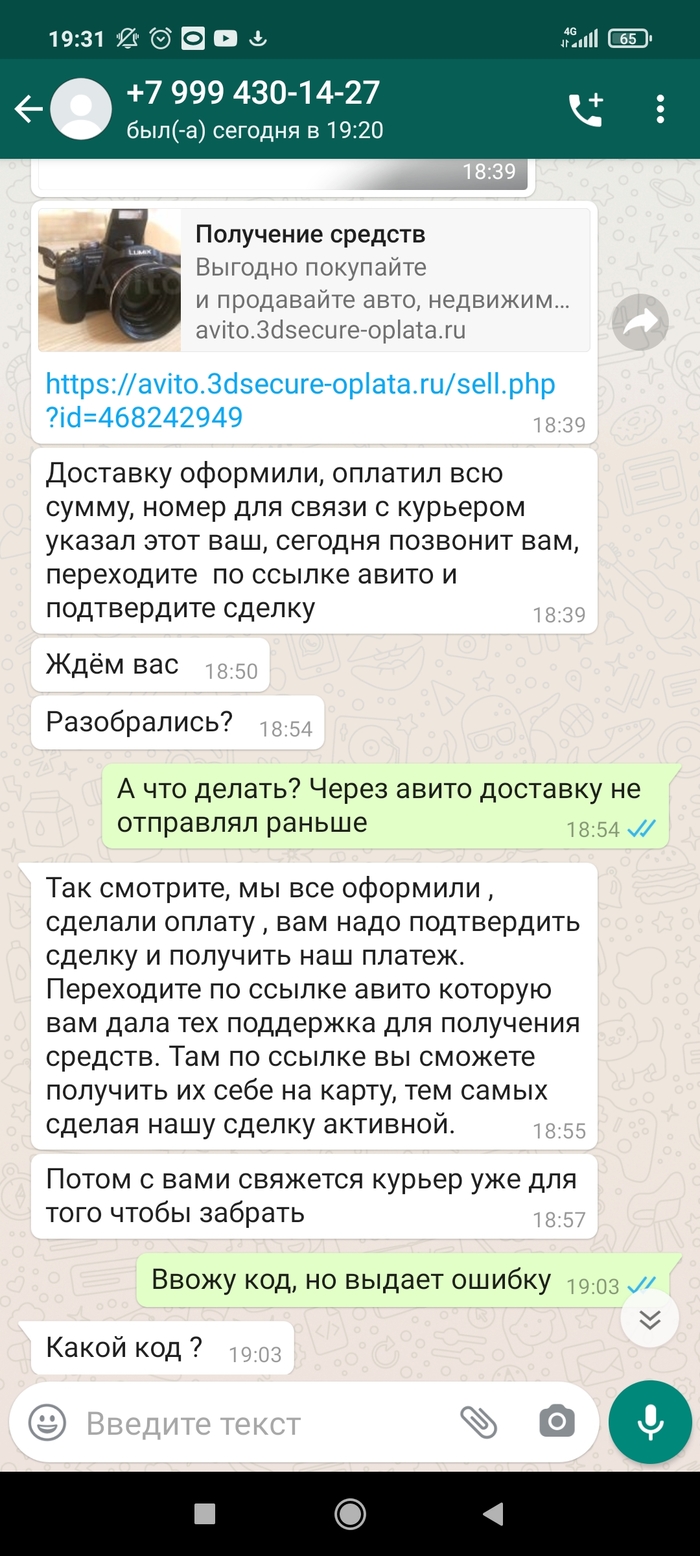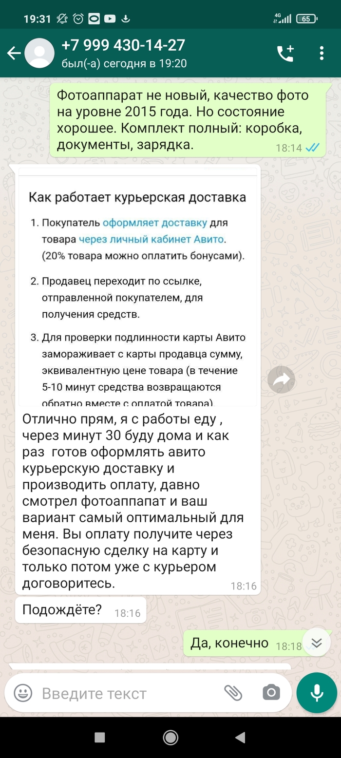 Спасибо Пикабу за просветительство. Благодаря данному сообществу, я думаю, многие люди смогли не попасться в лапы коварных разводил. Вот вам моя вчерашняя история. Продаю фотоаппарат на авито. Заинтересованных не было. Никто не писал и не звонил. И вдруг на ватсап прилетает сообщение.
