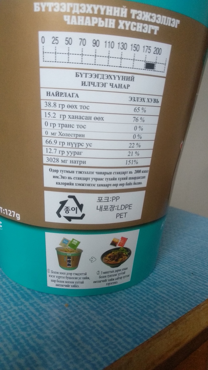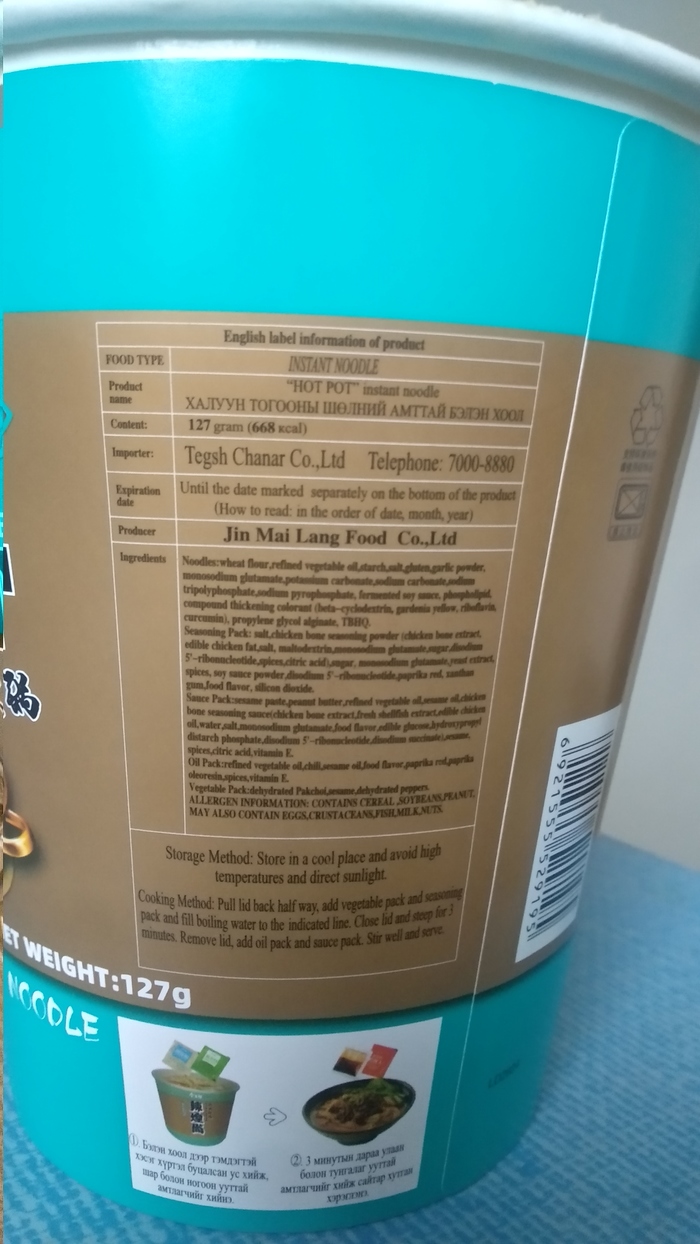 Имеем мы немаленькое ведёрко с лапшой и 4мя пакетиками: овощи, порошок, соус с привкусом кунжута и арахиса, и острое масло.
