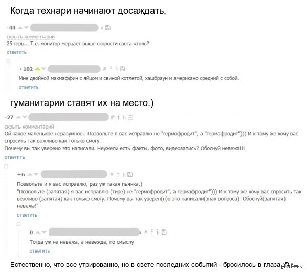 noksi 10 лет назад Стычки технарей и гуманитариев Пруфы не прилагаю, незачем) Технари vs гуманитарии Комментарии