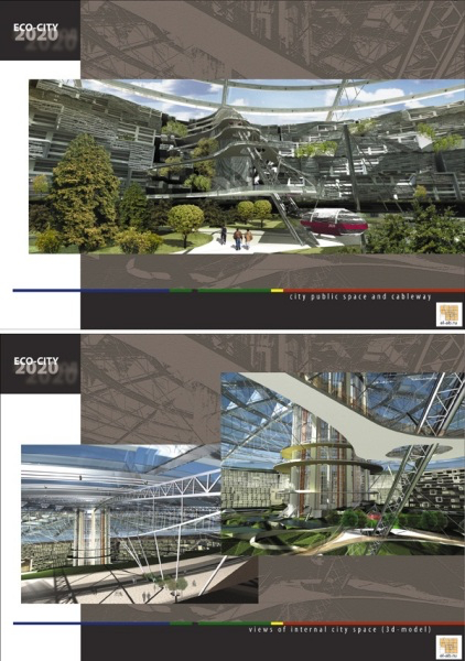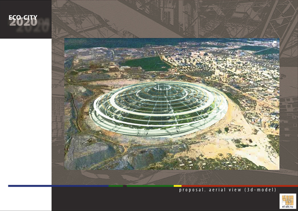 Я пытался найти глобальные проекты таких городов но не очень успешно. Единственное что нашел это вот такой проект от AB Elis Ltd эко города в кратере в Сибири