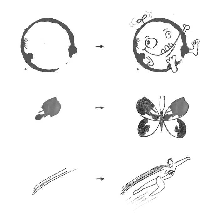 Простой пример: есть несколько отпечатков, помарок, клякс, которые уже есть. Сами по себе они просто хаос, ненужные вещи. Однако, если их попробовать дорисовать, может получится что-то интересное.