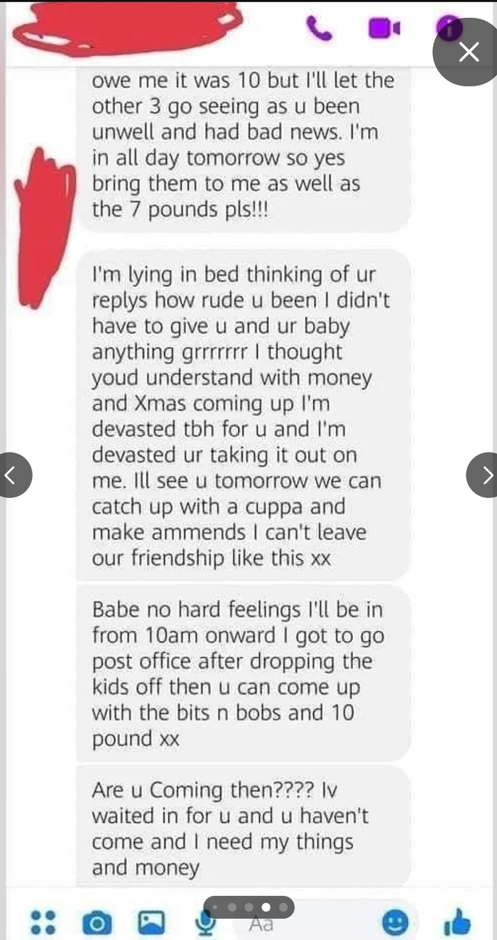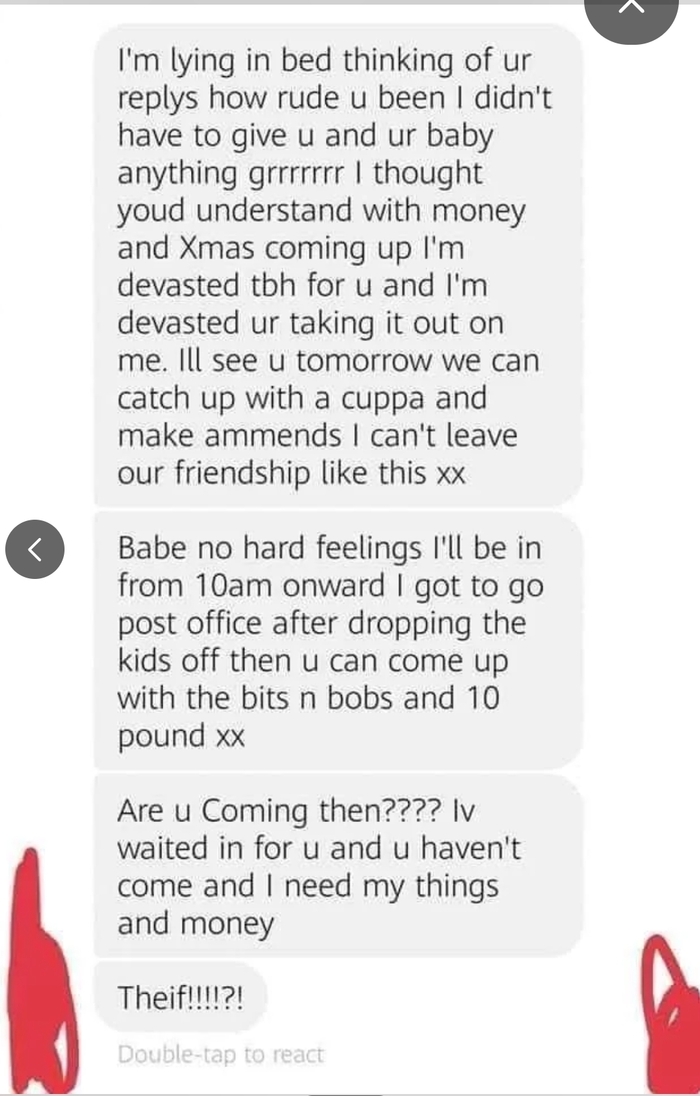 *Ну извини!!!! Я была терпелива с тобой мне надо знать потому что мне нужно экономить!!!! Не понимаю с чего т должна была использовать одеяло т мне должна 7 всего в сумме 10 но 3 я прощу потому чт т нездорова и из-за плохих новостей. Я дома завтра весь день так что привези завтра все вещи и 7 фунтов плиз!!!!