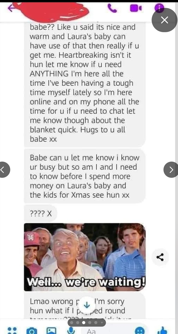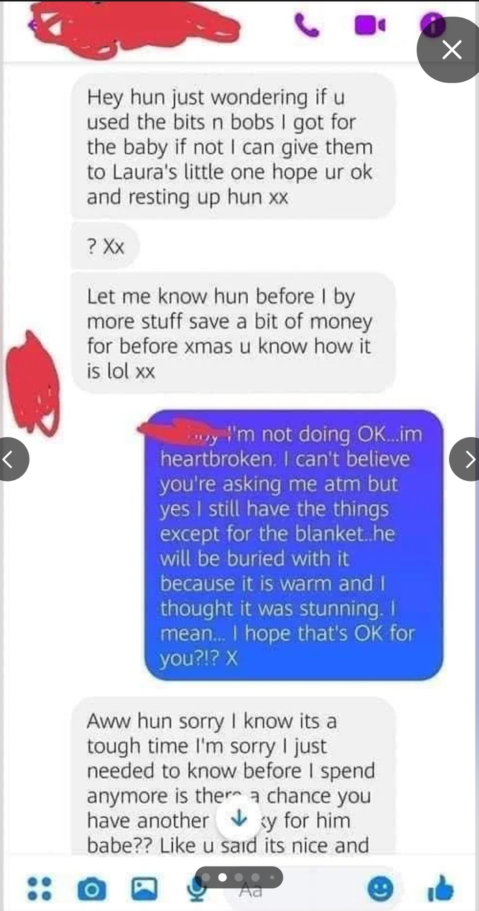 *Оууу сонц прости я знаю это трудное время прости мне просто надо знать прежде чем я еще потрачусь если ли шанс что т найдешь другое одеялко для него сонц?? Как т и сказала оно красивое и теплое и малыш Лауры сможет реально им пользоваться если т отдашь его мне. Это все просто сердце разрывает правда же сонц дай знать если те нужно ЧТО УГОДНО. Я здесь с тобой у меня сейчас и у самой сложные времена так что я постоянно в сети и на телефоне если те нужно поговорить но дай мне знать про одеяльце побыстрее. Обнимаю вас всех сонц чмок-чмок.
