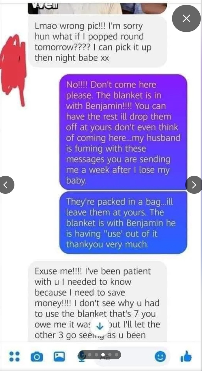 *Нет!!!! Не приходи, пожалуйста. Одеяльце с Бенджамином!!!! Ты получишь остальное, я привезу все тебе домой, даже не думай приходить... Мой муж вне себя из-за сообщений, которые ты шлешь мне всего через неделю после потери моего ребенка.