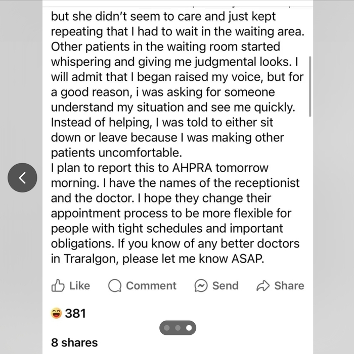 8. «Я очень разочарована отсутствием эмпатии и профессионализма у медперсонала и врача в медцентре Траралгона (п/п: крупный город в Австралии). У меня был назначен сегодня прием, и я крайне шокирована тем, как со мной обращались.