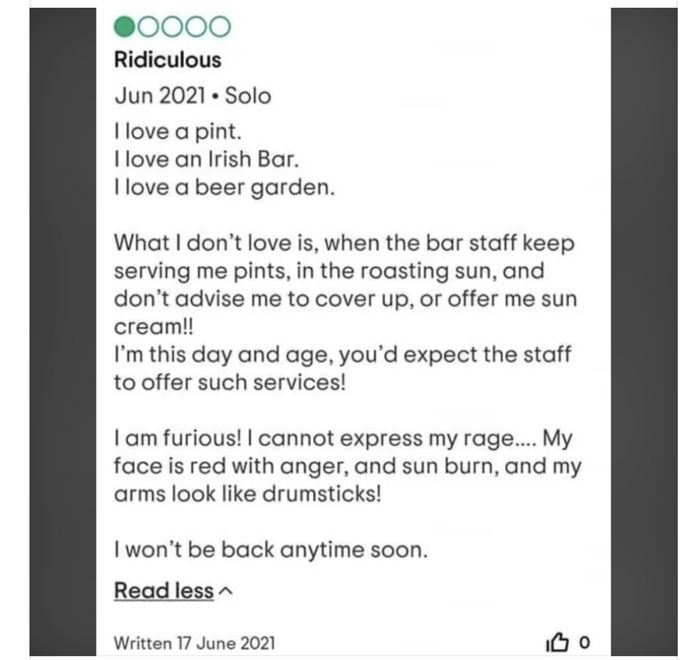 Что мне не понравилось, – что персонал продолжал приносить мне пиво на палящем солнце и не посоветовал мне прикрыться и не предложил солнцезащитного крема!!