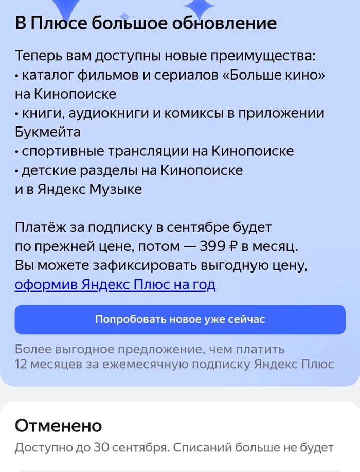Не обошла меня сия чаша по подъему стоимости Яндекс плюса, в связи с чем принято было решение прекратить участвовать в кормёжке этих жадных пидарасов. С грехом пополам подписка прекращена, с 1 октября он должен отключиться.