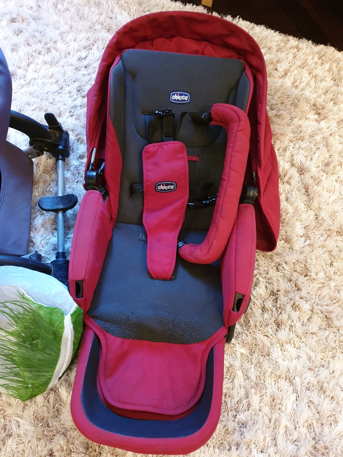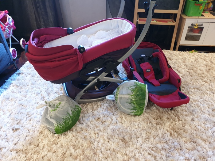 Коляска 2 в 1. В рабочем состоянии (но был один ремонт), колеса просто в пакетах. Только основание выглядит так себе, а вот все люльки и седушки целы. Chicco. Аксессуары вроде все на месте (дождевик, сетки, ремни, зимние колеса).