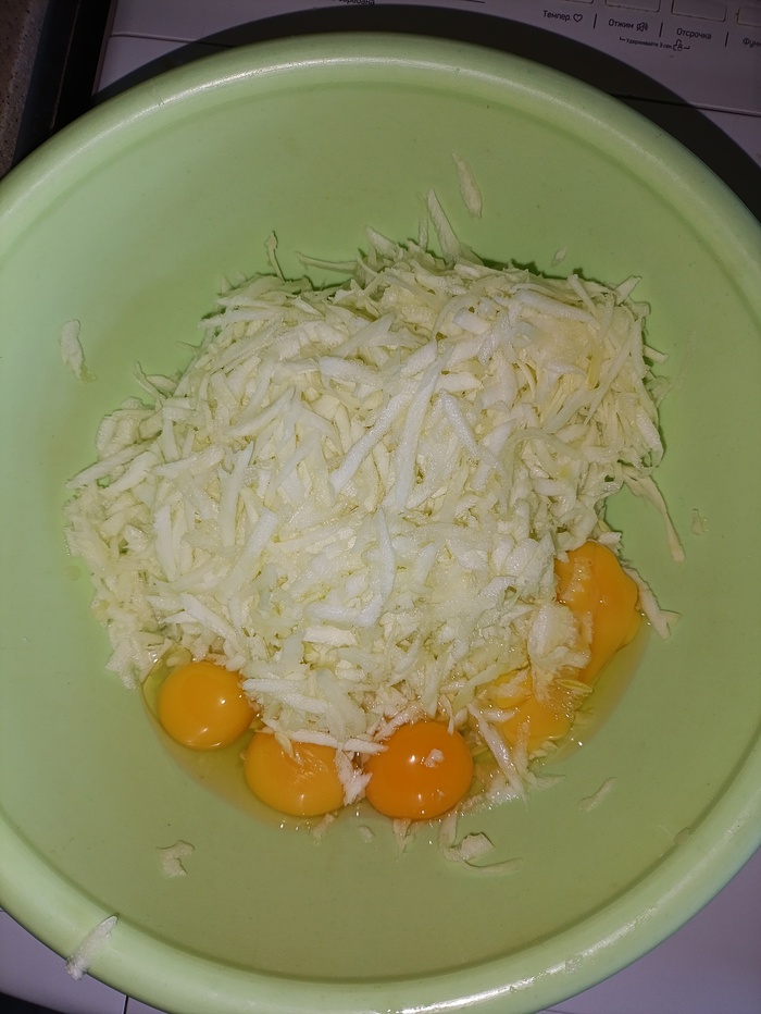 Чистим кабачки, натираем на крупной тëрке. Добавляем яйца.