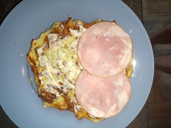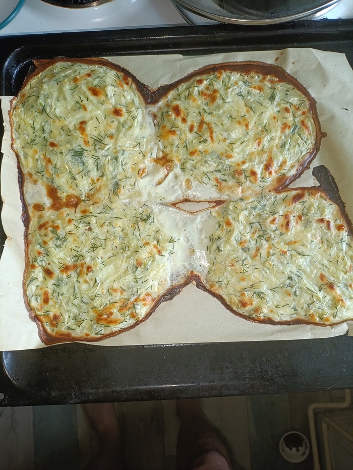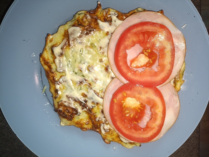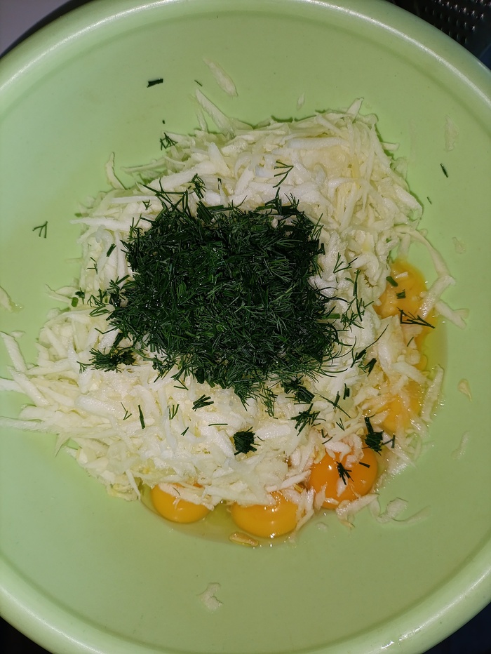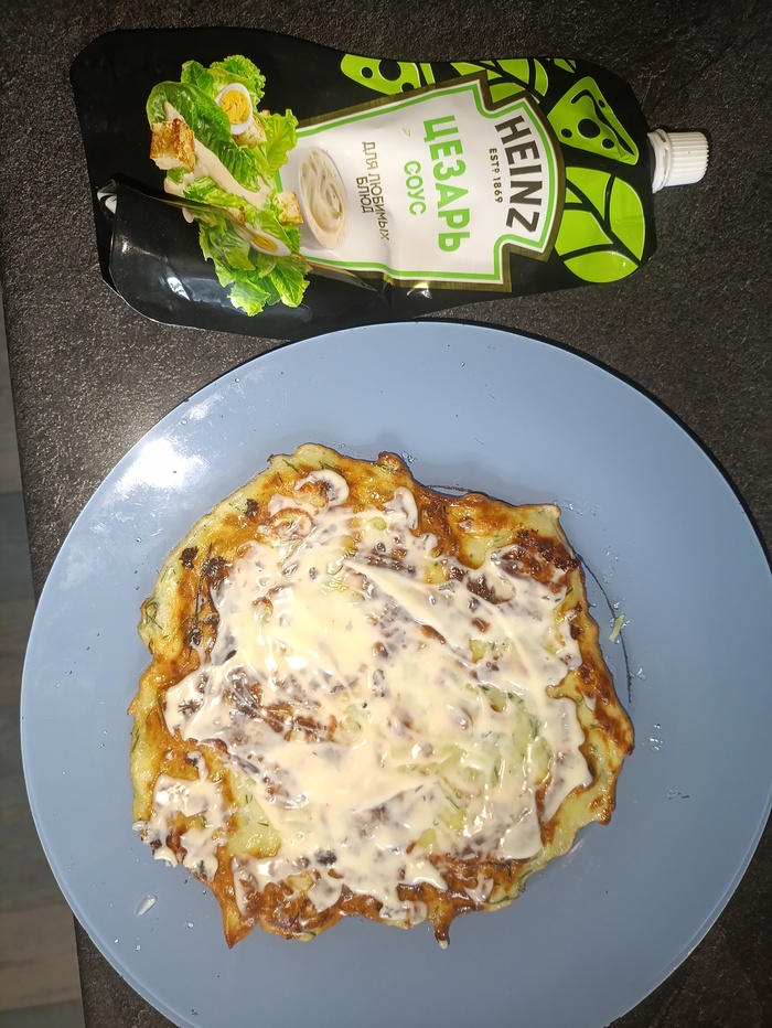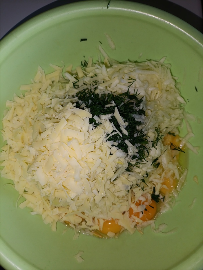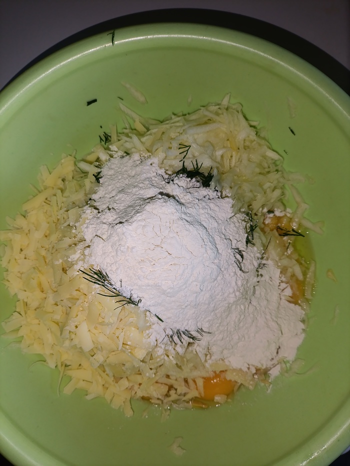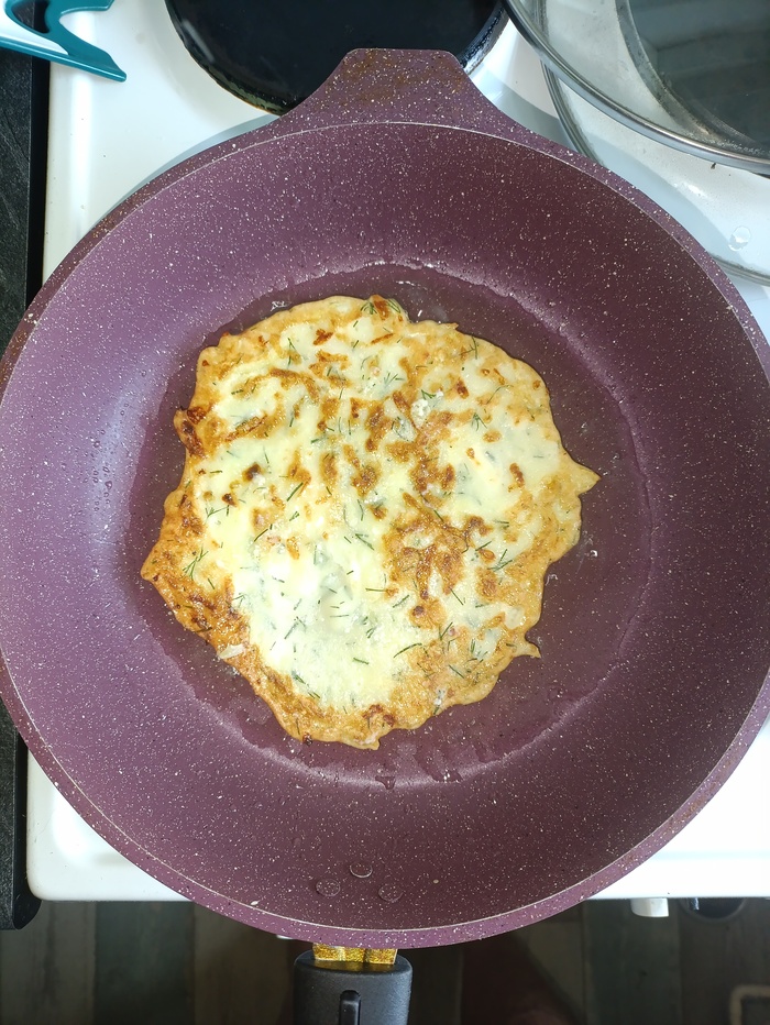 Вот тут я лопухнулся. Надо было добавить в тëртые кабачки соль, подождать и отжать лишнюю жидкость. Пришлось добавлять муки. В рецепте это выпекалось в духовке на пергаменте без масла. У меня всё растеклось и прилипло.