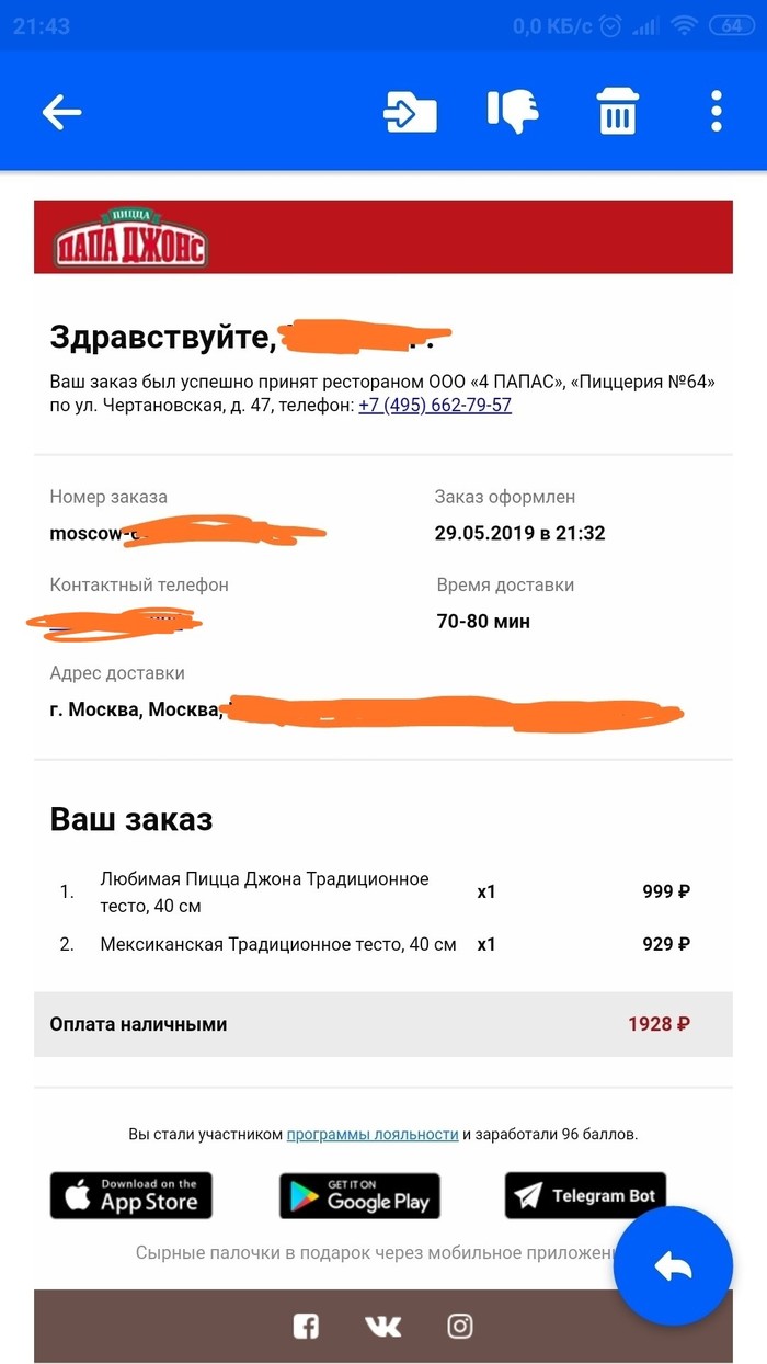 Заказ отменили. Дело в том, что поесть пиццу на ужин (зожники, диетологи и спортсмены)не читайте, умоляю), решили ещё в обед, дабы после работы с ужином не париться. И до этого было все то же самое, но общались по почте. Тогда сообщали, что письмо с промокодом в спаме (нет), потом, что ждать надо в течение суток. Т.е. первый заказ за сутки до принятия пищи- это очень странная акция))) Оплачивать, кстати, хотели наличкой. По безналу, соответственно, всю сумму сняли бы и ждали бы мы свою скидку до...