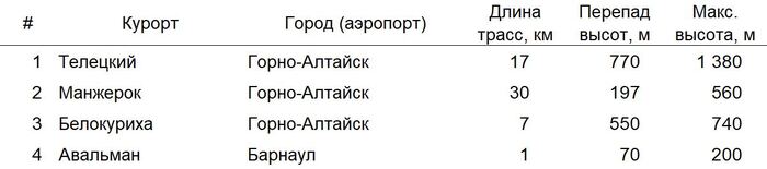 Самым крупным горнолыжным курортом Горного Алтая является курорт Телецкий. Курорт находится рядом с уникальным Телецким озером. Достоинствами курорта является большой перепад высот (770 м), максимальная высота 1380 м, всего доступны для катания 17 км трасс. Также в этой части можно выделить курорты Манжерок (30 км трасс, перепад высот 197 м, максимальная высота 560 м) и Белокуриха (7 км трасс, перепад высот 550 м, максимальная высота 740 м).