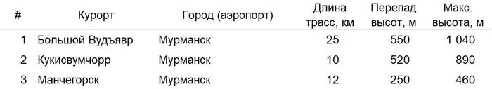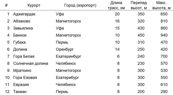 На Урале самый крупный курорт Аджигардак (20 км трасс, перепад высот 350 м), в Хибинах – Большой Вудъявр (30 км трасс, перепад высот 550 м).