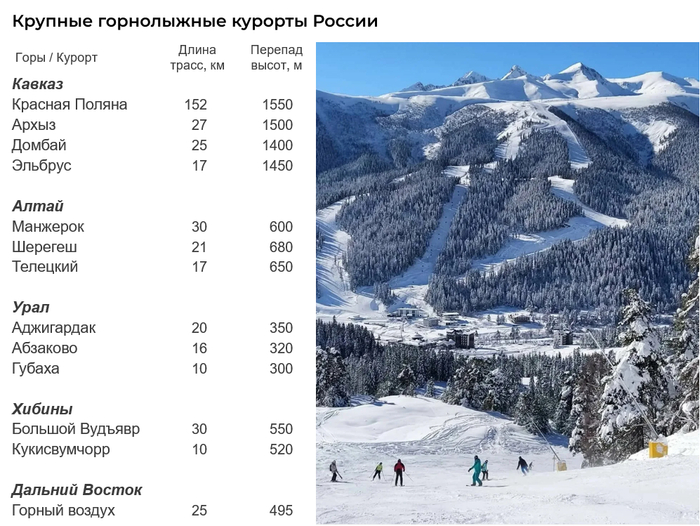 И снова о горах. Крупные горнолыжные курорты расположены в крупных горных системах. Кавказ, Алтай, Саяны, Урал, Хибины, Камчатка – всё это крупные горные системы.