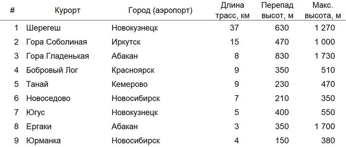 В Саянах можно выделить 9 горнолыжных курортов, среди которых 3 наиболее крупные – это курорты Шерегеш (37 км трасс, перепад высот 630 м, максимальная высота 1270 м), Гора Соболиная (15 км трасс, перепад высот 470 м, максимальная высота 1000 м) и Гора Гладенькая (8 км трасс, перепад высот 830 м, максимальная высота 1730 м).