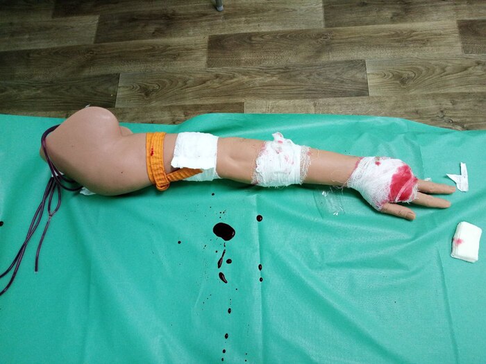 Имитирует сразу 4 варианта повреждений: травматическая ампутация, линейная рана конечности, сквозная рана конечности, слепая рана смежной области. Позволяет отработать наложение жгута, давящей повязки и тампонаду раны.