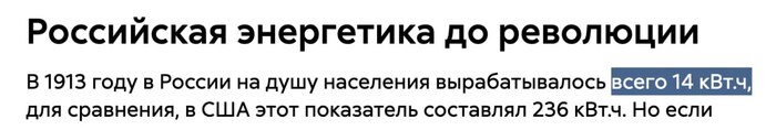 В 1913 году в России на душу населения вырабатывалось всего 14 кВт.ч, для сравнения, в США этот показатель составлял 236 кВт.ч. Но если по количественным характеристикам разница очевидна, то по качественным дореволюционная Россиия нисколько не уступала передовым зарубежным странам.
