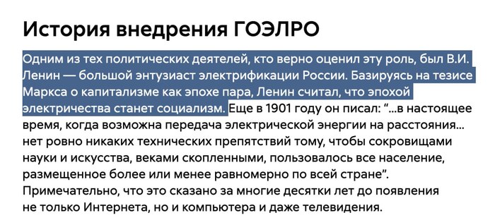 Одним из тех политических деятелей, кто верно оценил эту роль, был В.И. Ленин — большой энтузиаст электрификации России. Базируясь на тезисе Маркса о капитализме как эпохе пара, Ленин считал, что эпохой электричества станет социализм. Еще в 1901 году он писал: “…в настоящее время, когда возможна передача электрической энергии на расстояния… нет ровно никаких технических препятствий тому, чтобы сокровищами науки и искусства, веками скопленными, пользовалось все население, размещенное более или менее равномерно по всей стране”. Примечательно, что это сказано за многие десятки лет до появления не только Интернета, но и компьютера и даже телевидения.
