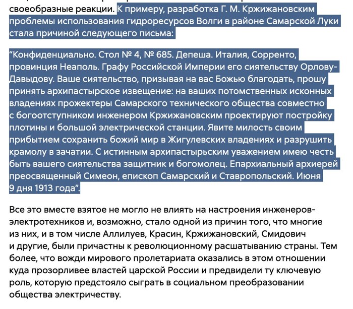 “Конфиденциально. Стол № 4, № 685. Депеша. Италия, Сорренто, провинция Неаполь. Графу Российской Империи его сиятельству Орлову-Давыдову. Ваше сиятельство, призывая на вас Божью благодать, прошу принять архипастырское извещение: на ваших потомственных исконных владениях прожектеры Самарского технического общества совместно с богоотступником инженером Кржижановским проектируют постройку плотины и большой электрической станции. Явите милость своим прибытием сохранить божий мир в Жигулевских владениях и разрушить крамолу в зачатии. С истинным архипастырьским уважением имею честь быть вашего сиятельства защитник и богомолец. Епархиальный архиерей преосвященный Симеон, епископ Самарский и Ставропольский. Июня 9 дня 1913 года”.
