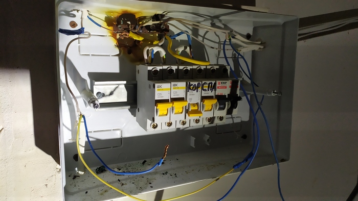 Это было под штукатуркой. Под изолентой оплавившиеся винтовые клемники.
