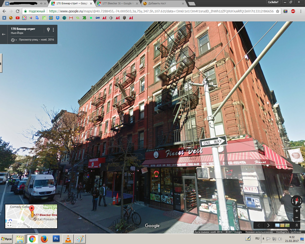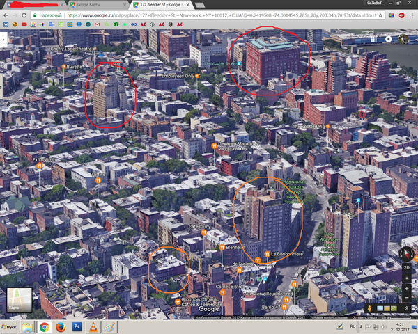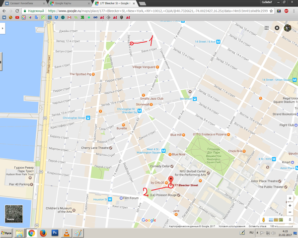 Расположен он (1), как это ни странно, лишь на несколько кварталов к северу от фейкового адреса (2). И там ничего интересного, к сожалению, нет. Даже само здание пририсовано.