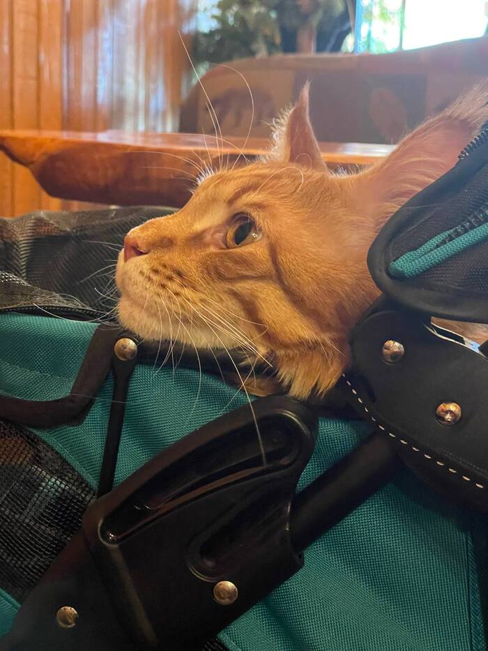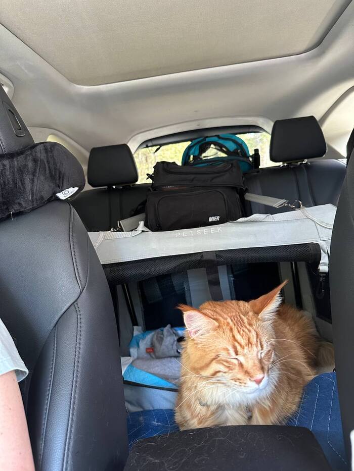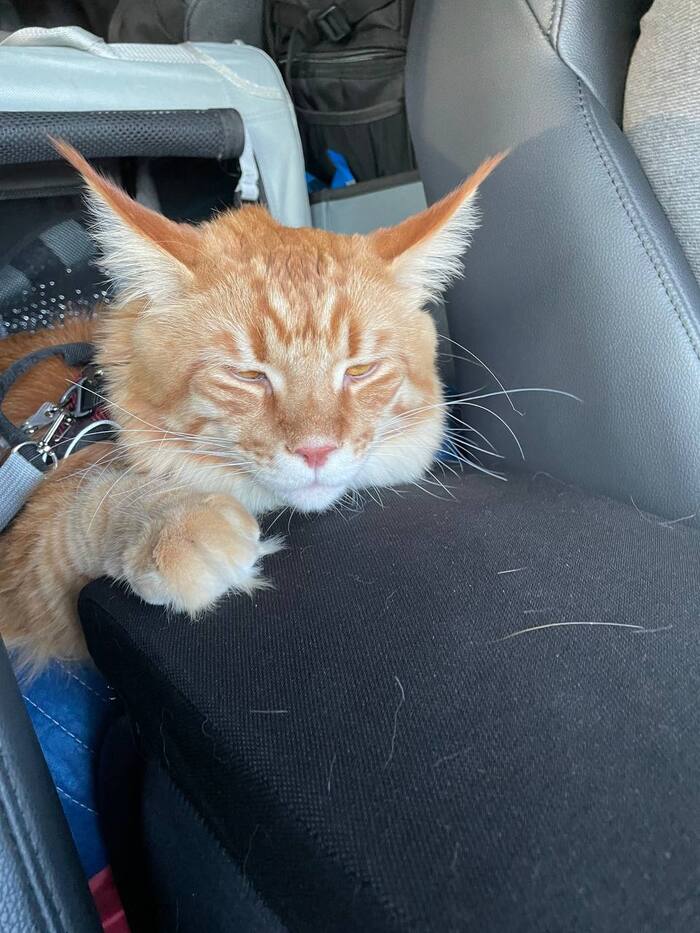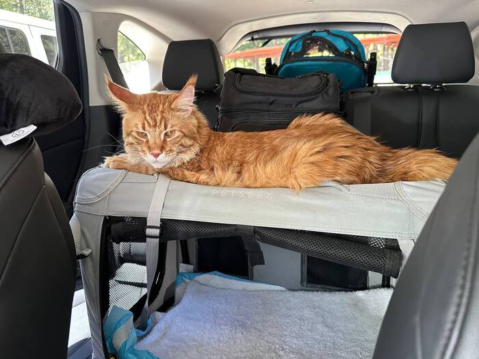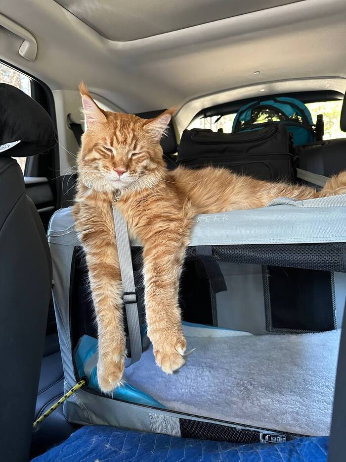 В целом перенес путешествие на машине 5 часов в один конец, нормально. Дрых большую часть в переноске на заднем сидении.