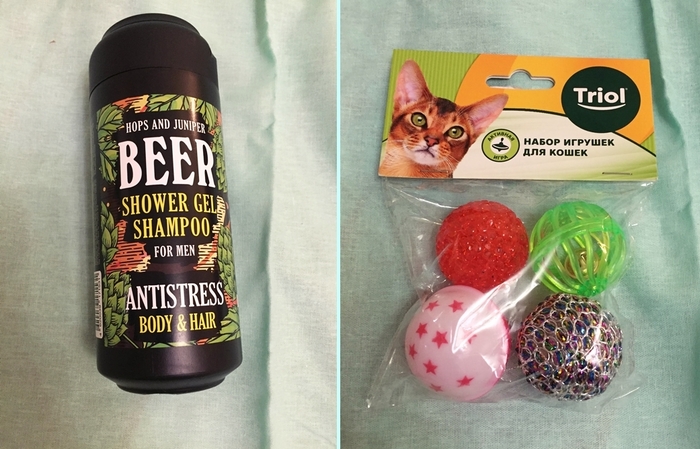 Мужу достался гель-шампунь с пивным ароматом)) а кисе игрушки)