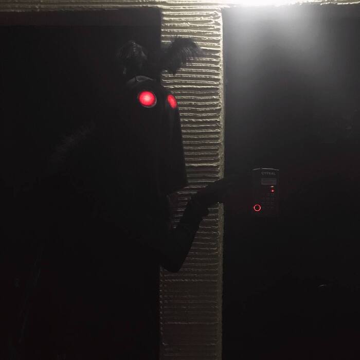 глаза - плоские светильники на батарейках, прикреплённые к резинке как налобный фонарик, усики - страусиные перья на ободке, чехол на лицо сшила из полупрозрачной старой шмотки