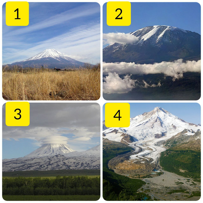 Ответ: 1 — Фудзи, 2 — Килиманджаро, 3 — Сопка, 4 — Илиамна