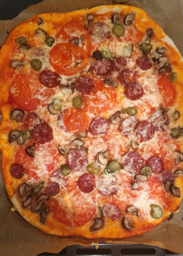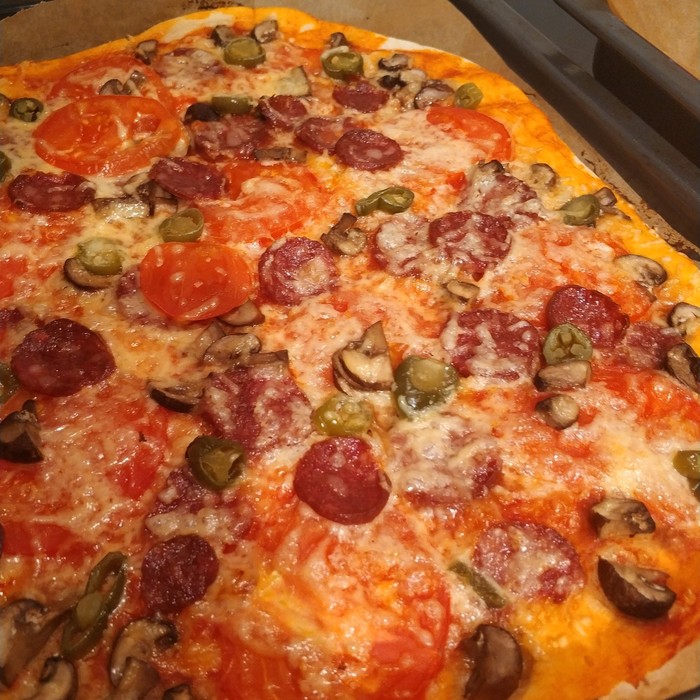 Пока многие активно уничтожают запасы гречи, опасаясь набрать к лету, я подумала: "не факт, что лето у нас будет, надо жить сегодняшним днём" и забахала пиццу, точнее 2 пиццы размером с противень каждая.